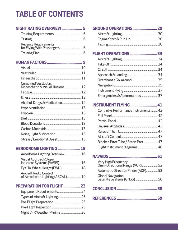 Provides Canadian Flight Instructors with a reference-guide to ensure their night rating students receive all pertinent information relating to flying at night. Have your students study from this guide to prepare for the differences between flying at night and flying during the day.